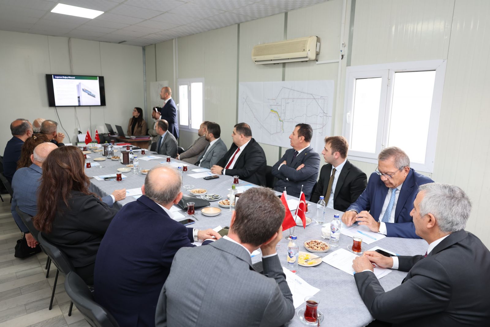 Tomsuklu’daki şantiye binasında yapılan toplantıda Bölge Müdürü Hüseyin Çanak tarafından sunum yapılarak Bölgede devam etmekte olan alt yapı çalışmalarının son durumu ve bundan sonra yapılacak çalışmalar hakkında bilgi verildi.